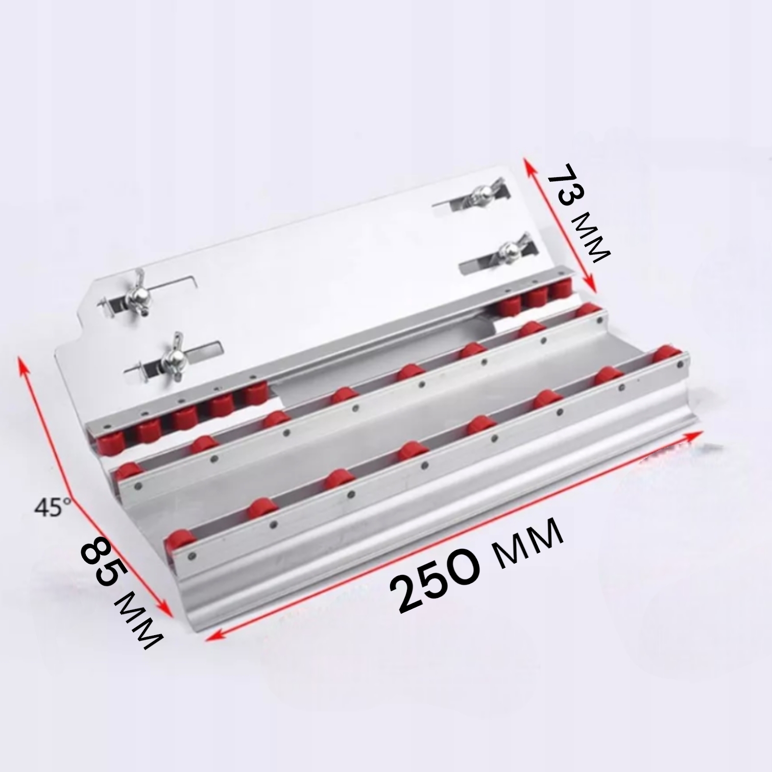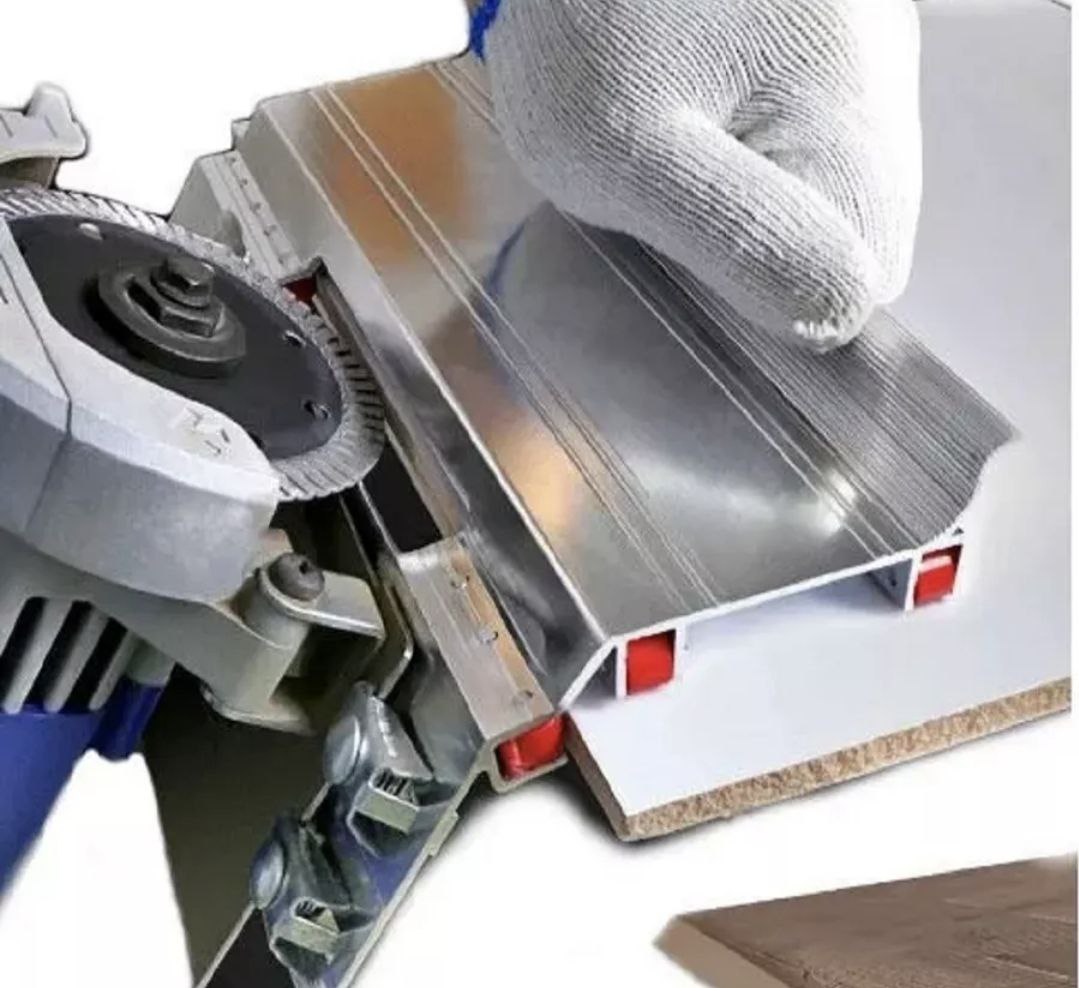 Рамка для резки фаски под углом 45 градусов выполнена из алюминиего сплава и используется для работы по камню, керамике, плитке, но только на ровной поверхности. Резиновые колеса позволяют двигать УШМ плавно и ровно, не ломая края. Общая длина инструмента 250 мм, отверстие для пильного диска 100 мм.