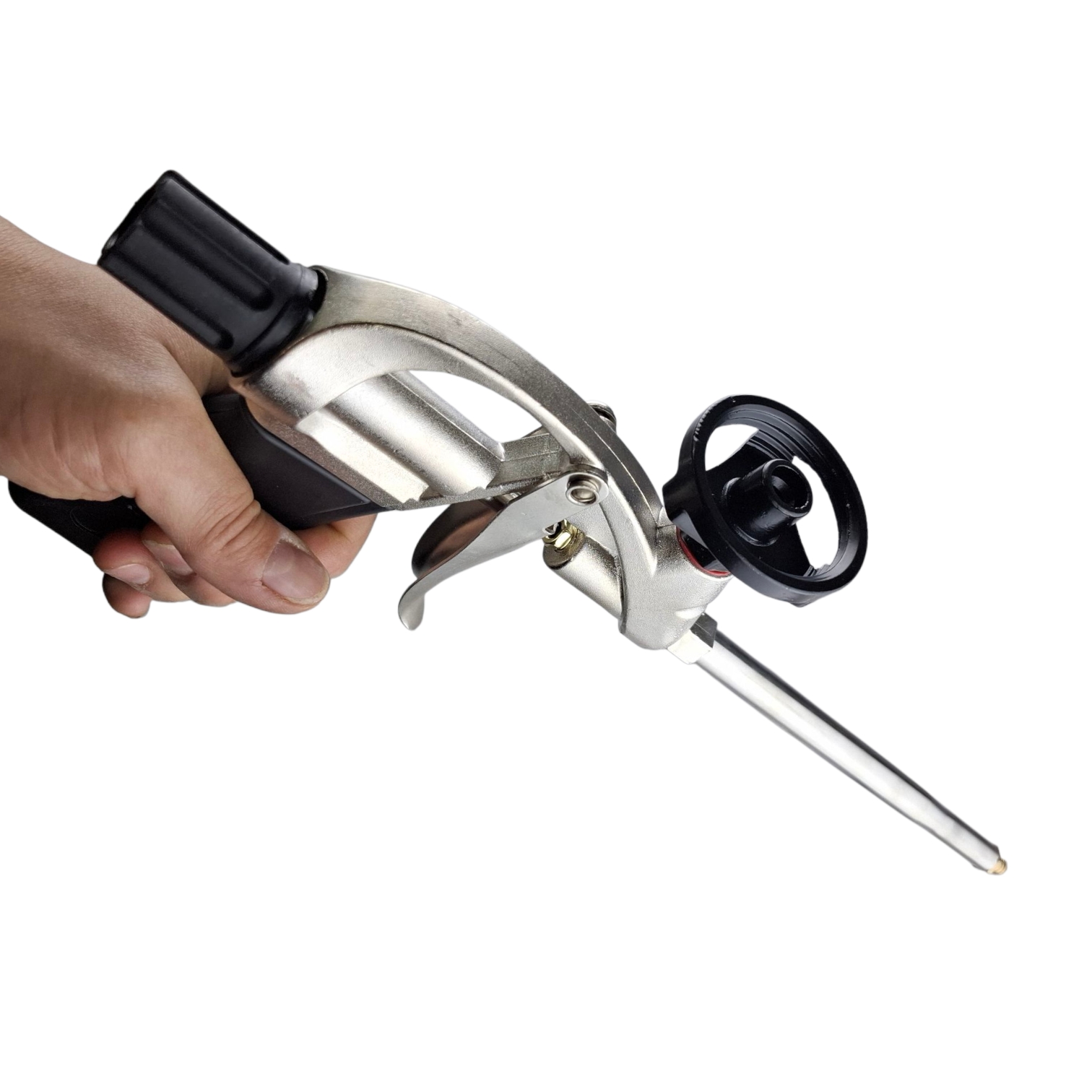Цельнометаллический регулировочный винт оборудован удобной пластиковой ручкой, которая позволяет регулировать напор и наносить пену аккуратно и точно.