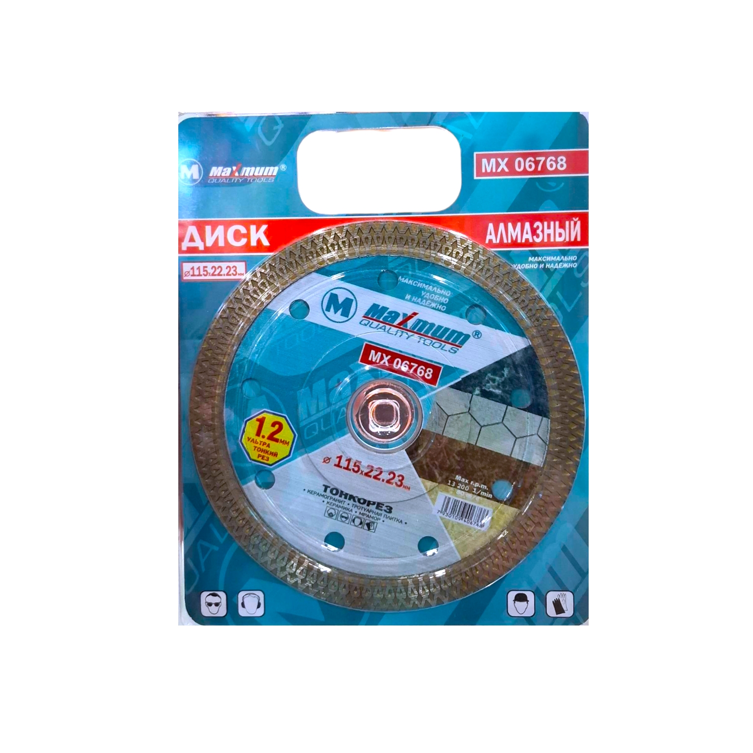 Алмазный диск MAXIMUM предназначен для сухой резки. Диск диаметром 115 мм с тонким пропилом (1,2 мм) и турбокромкой обеспечивает быстрое резание тротуарной плитки, керамогранита, мрамора и других материалов. Он рассчитан на высокоскоростную работу (до 12 500 об/мин) и обеспечивает чистый рез с минимальным количеством пыли и прилагаемых усилий.