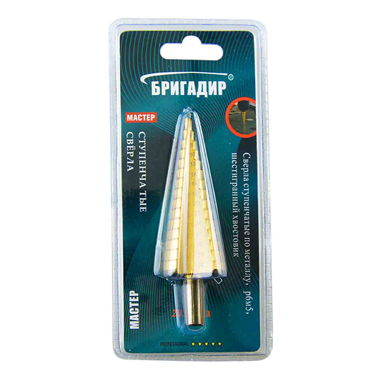 Ступени имеют удобную маркировку фактического диаметра. Популярной сферой использования ступенчатого сверла по металлу является шлифование уже готового отверстия. Высокая скорость сверления и качество кромки достигается даже если металл слишком тонкий. Острый наконечник с легкостью входит даже в самый твердый металл. Сверло с титановым покрытием имеет 9 ступеней с шагом в 2- 3 мм, которые помогают создать оптимальный и точный размер отверстия.